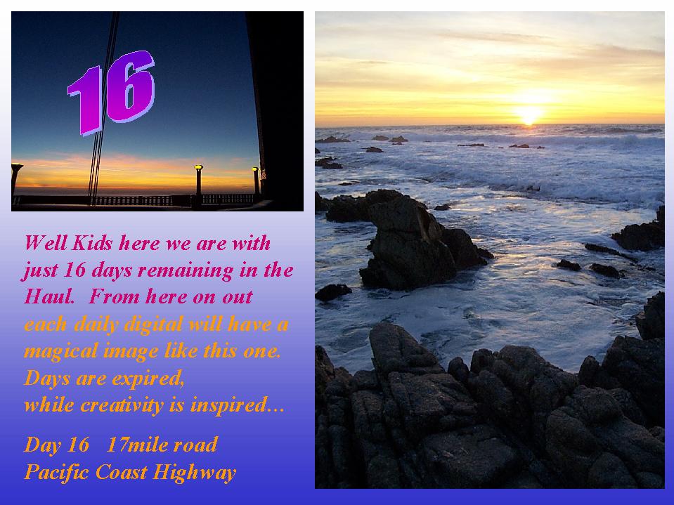 Back to Buck's for breakfast Buck's is great meeting place for successful VC types from the Silicon Valley. On Sunday we had spoke with the manager, Ron about the Haul. He told us to come back for breakfast on Wednesday, and that he would introduce us to some possible investors that might be interested in backing the project. You see, we are at the point now where we need to find a key investor or benefactor to underwrite the project. With the guidance of John Coyle, I am convinced that we will find one. After the Haul, absolute production must begin on final product. Our first financial obstacle is getting all of the film processed the cost of this alone will exceed $6000-. If anyone is interested let me know. I will continue to ask until I get a yes answer from someone out there. At any rate, John and I defined a few things, and then he sent me on my way with a kind and generous cash donation, and a festive colorful wreath for the grill of the Phalcon. She's looks real pretty. I got on the road and took the Pacific Coast Highway all the way down to San Luis Obisbo. The coast was unbelievable. My first stop was in Santa Cruz. I got my haircut there and then met up with this surfer duded name John that Coyle had told me to call. Santa Cruz was very cool, some of the best surfing is there. I got back on the road and was greatly impressed by Pebble Beach, 17 Mile Drive, and Big Bur. The California coastline is one of the most magnificent places that I have ever been. I arrived at an Econo Lodge after dark, I grabbed a room and some rest.